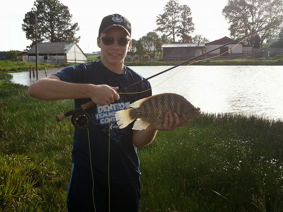 Moscas na água, ficamos um bom tempo sem nenhuma ação das tilápias, variamos iscas e cores, mas nada. Porém no finalzinho da tarde, perto das 6 horas, um ataque. No primeiro salto descobri que não se tratava de uma tilápia, e sim uma traíra. Ela serviu para dar uma animada na pescaria. Mesmo não sendo o peixe pretendido, deu uma animada na pescaria. "Caiu na rede é peixe".
